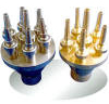 中心直上噴頭是在同一個配水箱上安裝許多萬向直流噴嘴,當這些噴嘴規格相同時,噴出的水姿雄壯筆直;當這些噴嘴規格不完全相同時,大小噴嘴布設得當,噴出的水姿粗壯有力,層次分明、主題突出,是大型噴泉必備的主要噴頭。該噴頭也叫中心水柱。